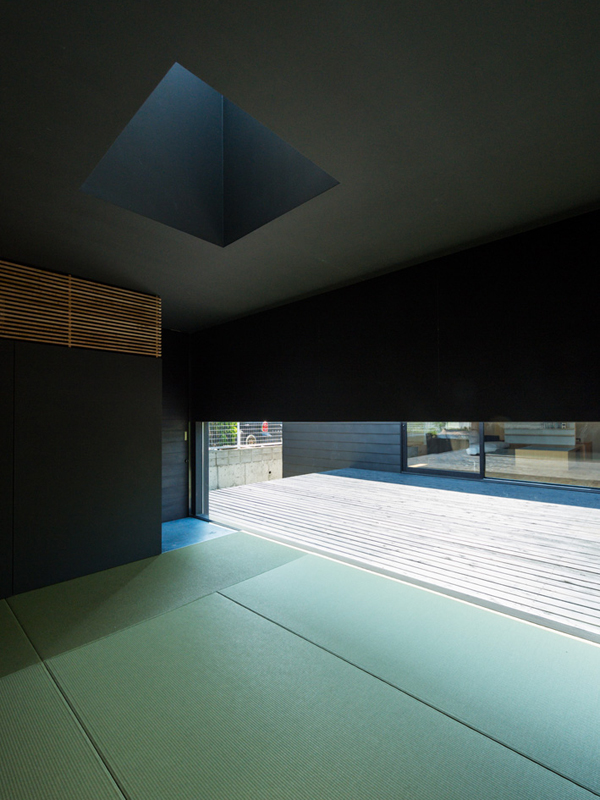和室は母屋とは対照的に墨色を基調としたダークな色でまとめられ、自らと向き合えるような静寂の空間となっている。低い天井に設置されたトップライトは月明かりも照明に変えてしまう。